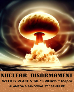 Join the nuclear disarmament community at the intersection of East Alameda and Sandoval in Santa Fe for the weekly peaceful protest in support of the Treaty on the Prohibition of Nuclear Weapons. Join with Veterans for Peace, CCNS, Nuclear Watch NM, Loretto Community, New Mexico Peace Fest, Pax Christi and others. Bring your flags, signs and banners.